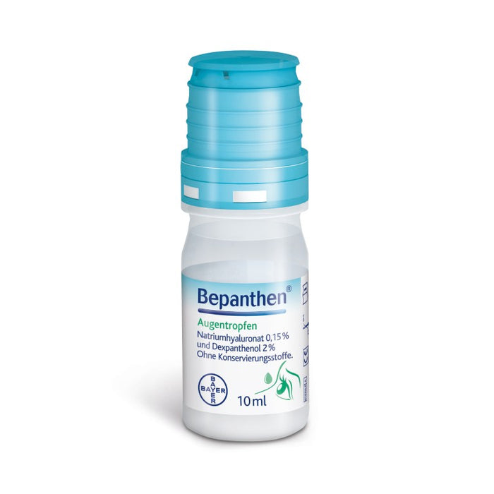 Bepanthen Augentropfen bilden einen sterilen, konservierungsmittelfreien, viskoelastischen, klaren Schutzfilm für die Hornhaut. Bepanthen Augentropfen enthalten Natriumhyaluronat, das Natriumsalz der Hyaluronsäure, das aufgrund seiner besonderen physikalischen Eigenschaft einen gleichmäßigen, stabilen und besonders lang haftenden Schutzfilm auf der Hornhaut bildet, ohne die Sehleistung zu beeinträchtigen. Darüber hinaus enthalten Bepanthen Augentropfen das Provitamin B5 (Dexpanthenol), das aufgrund der hohen Wasserbindungskapazität die Fähigkeit hat, das Auge zu befeuchten und zusätzlich zu pflegen. Dadurch werden die feuchthaltenden Eigenschaften des Natriumhyaluronates sinnvoll unterstützt.