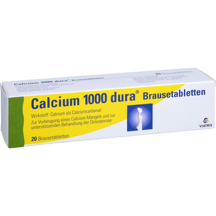 Calcium 1000 dura Brausetabletten. Wirkstoff: Calcium als Calciumcarbonat. Anwendungsgebiete: zur Vorbeugung eines Calciummangels bei erhöhtem Bedarf (z.B. Wachstumsalter, Schwangerschaft, Stillzeit) und zur unterstützenden Behandlung der Osteoporose.