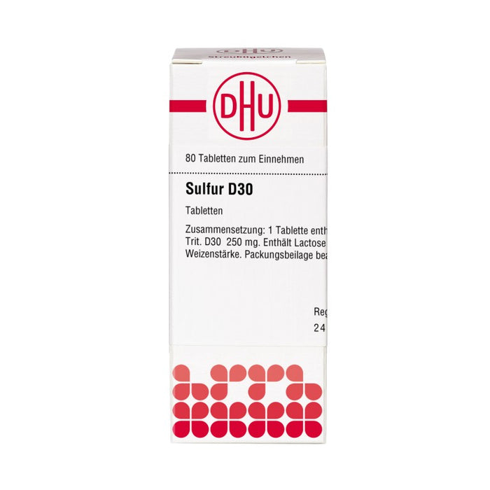 Sulfur D30, Tabletten. Anwendungsgebiete: Registriertes homöopathisches Arzneimittel daher ohne Angabe einer therapeutischen Indikation.