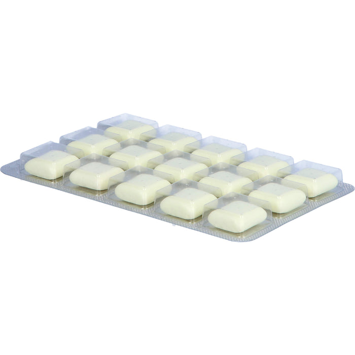Kaugummi-Grundmasse (enthält Butylhydroxytoluol (E 321)), Acesulfam Kalium, Arabisches Gummi, Carnaubawachs, Chinolingelb (E 104), Levomenthol, leichtes Magnesiumoxid, Natriumcarbonat, Pfefferminzöl, Titandioxid, Xylitol.