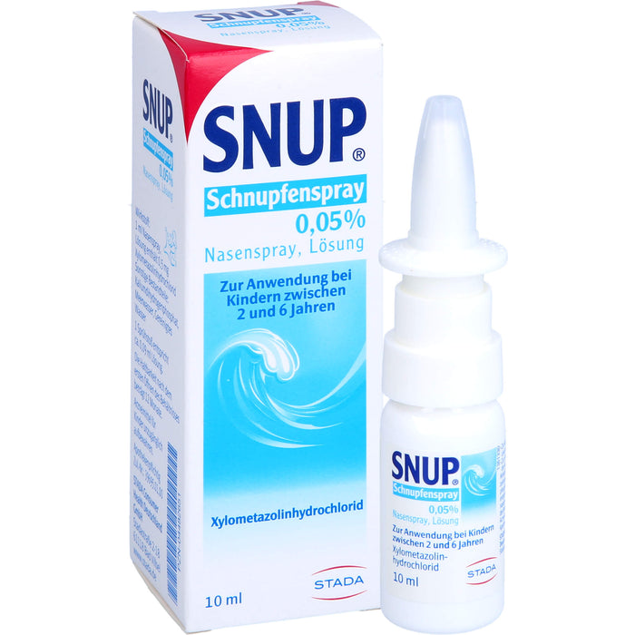 Snup Schnupfenspray 0,05%, Nasenspray, Lösung. Wirkstoff: Xylometazolinhydrochlorid. Anwendungsgebiete: zur Abschwellung der Nasenschleimhaut bei Schnupfen, anfallsweise auftretendem Fließschnupfen (Rhinitis vasomotorica), allergischem Schnupfen (Rhinitis allergica) und/oder zur Erleichterung des Sekretabflusses bei Entzündung der Nasennebenhöhlen sowie bei Katarrh des Tubenmittelohrs in Verbindung mit Schnupfen.